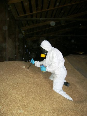 Сам процесс фумигации обязательно должен проводиться работниками специальных служб СЭС, поскольку для обычного человека это небезопасно. В первую очередь профессионалы осматривают общее состояние помещения и при необходимости герметизируют все отверстия и щели в стенах. Далее производится оценка обстановки и подбор нужного инсектицида (все зависит от площади зернохранилища), и только после этого начинается непосредственная фумигация. Специалисты работают в специальных костюмах, что защищает их от химикатов. Кроме того, в процессе обработки они используют самое современное оборудование, которое обеспечивает лучший эффект от самой обработки. После обработки помещения необходимо оставить все как есть и не заходить туда несколько суток для того, чтобы здание проветрилось. По установленным нормам инсектицид должен выветриваться пару дней, после чего все вредители уже гарантированно будут уничтожены.